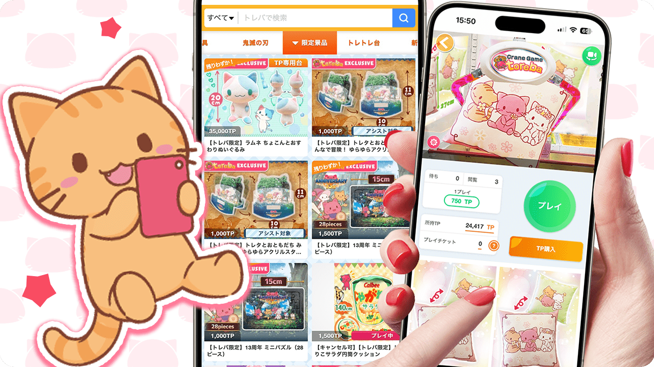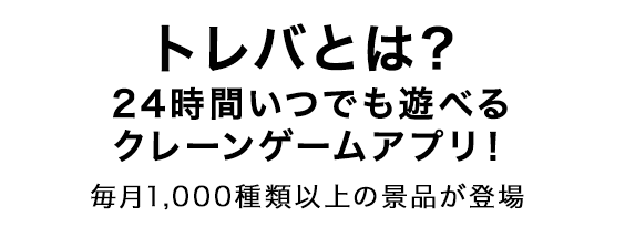 2,300万ダウンロード突破! スマホで無料で遊べるクレーンゲーム! トレバはインターネットを通して、遠隔操作で本物のクレーンゲームが楽しめるオンラインクレーンゲームです。 プレイしたいキャッチャーを選んで、簡単操作で本物のクレーンゲーム機のアームを動かし、景品をキャッチ♪ 獲得した景品はご自宅にお届けします! ぬいぐるみ、フィギュア、かわいい雑貨など1,000種類以上を取り扱い! 欲しい景品がきっと見つかる! クレーンゲームのプレイ動画が残せるので、過去の自分のリプレイや、 他の人のプレイ動画を閲覧することができます。